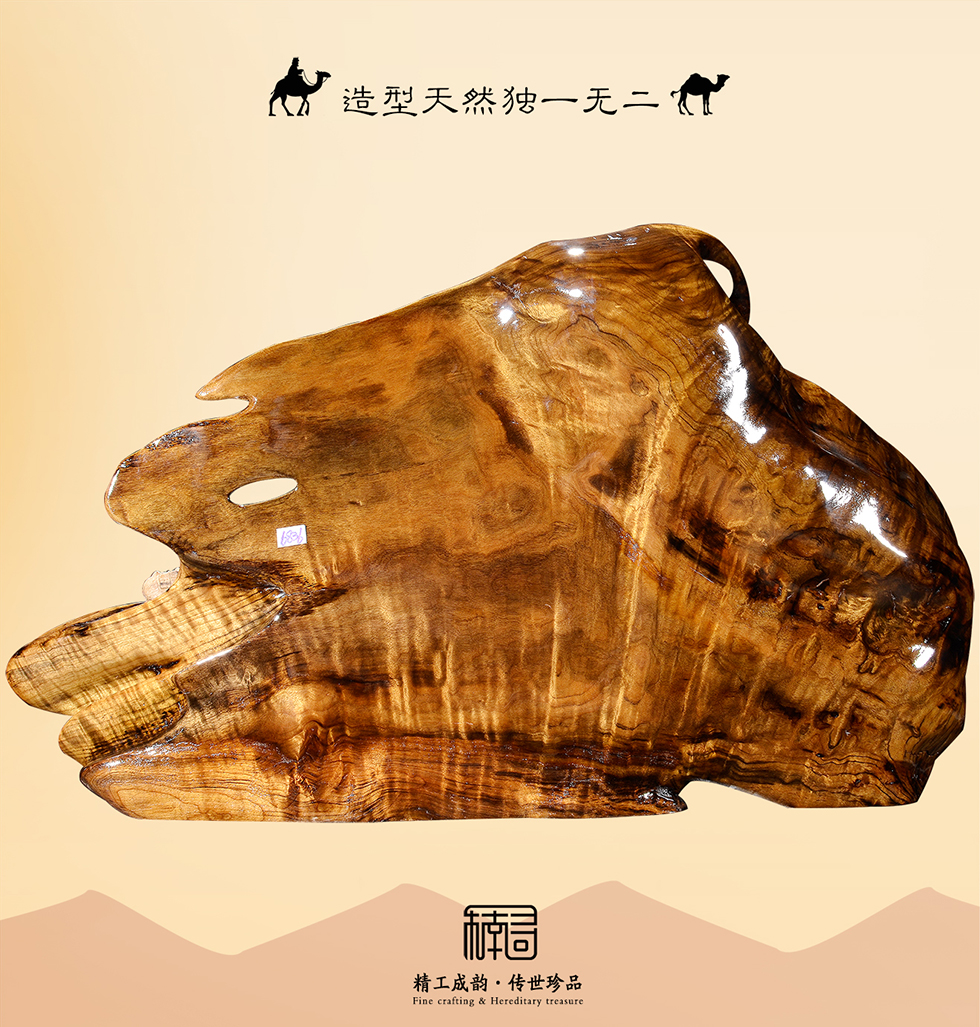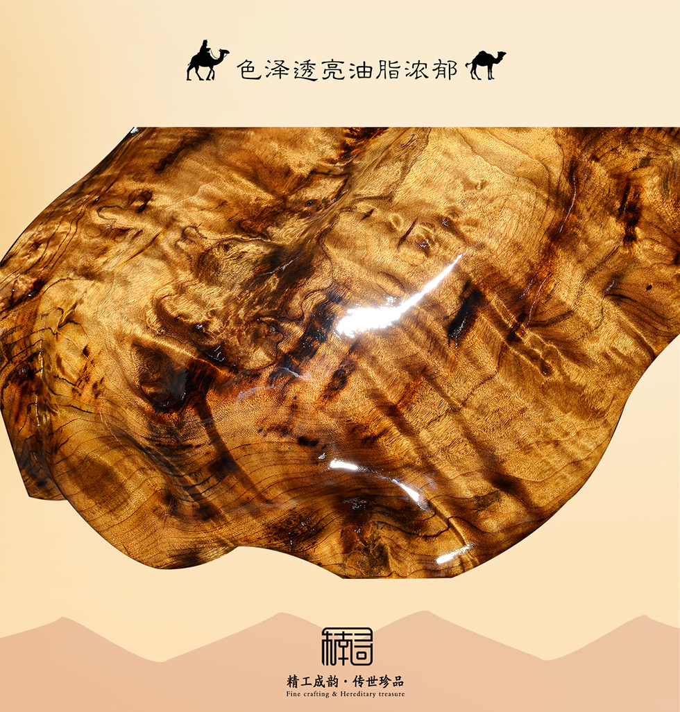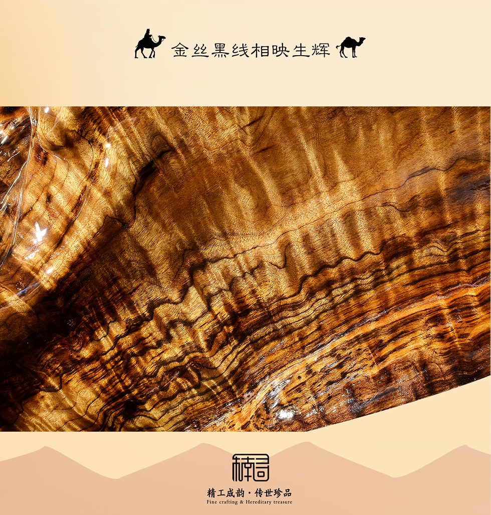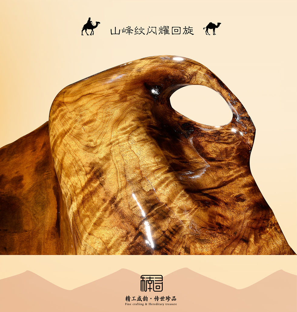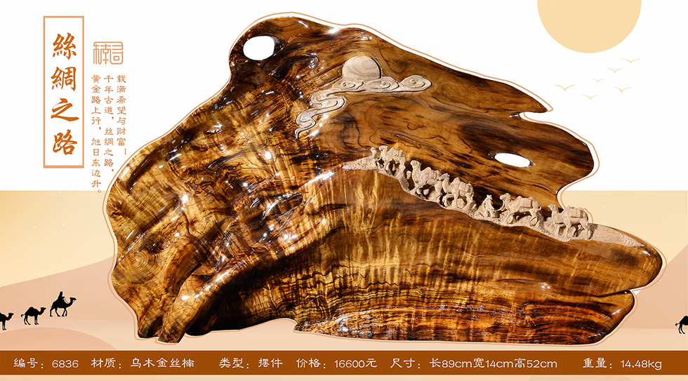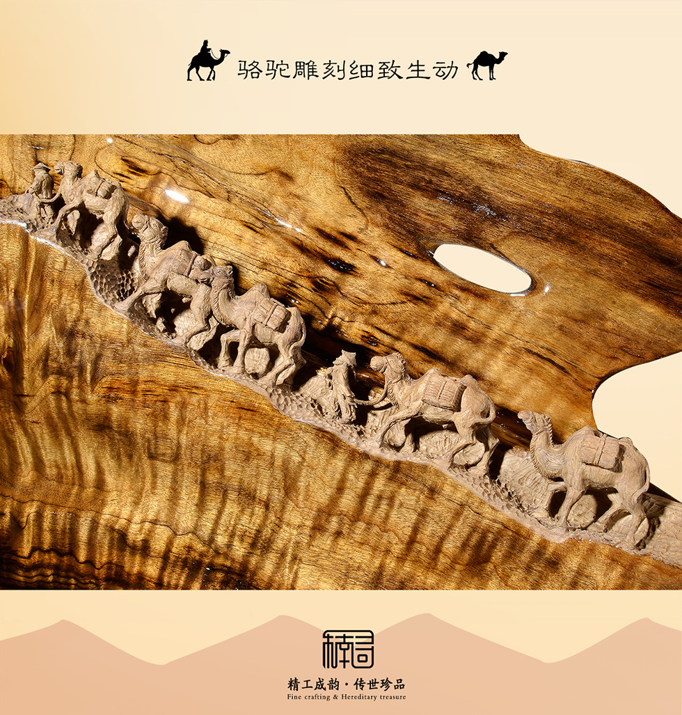 扇面造型,曲线柔和光滑,乌木金丝楠色泽浓郁,质感厚重,金丝纹路汇成黄金古道,景致浑然天成;骆驼商人、白云旭日雕刻精细,姿态活灵活现,完美诠释了对美好前路的欣喜之情和追逐之景。
