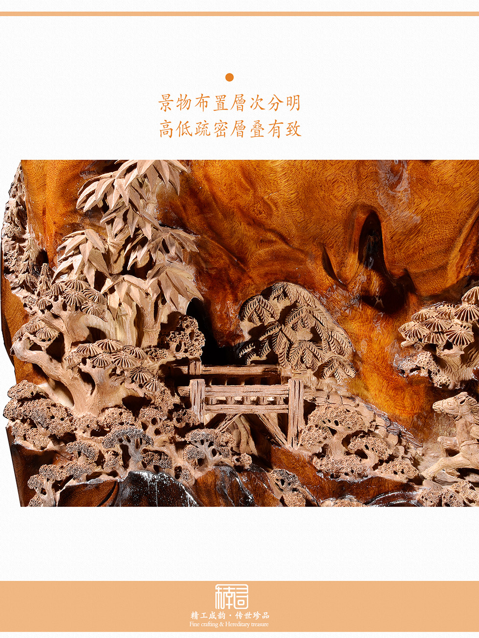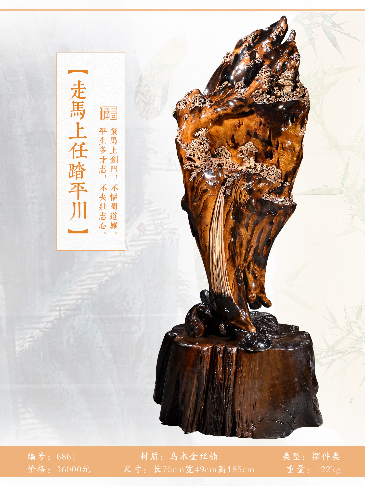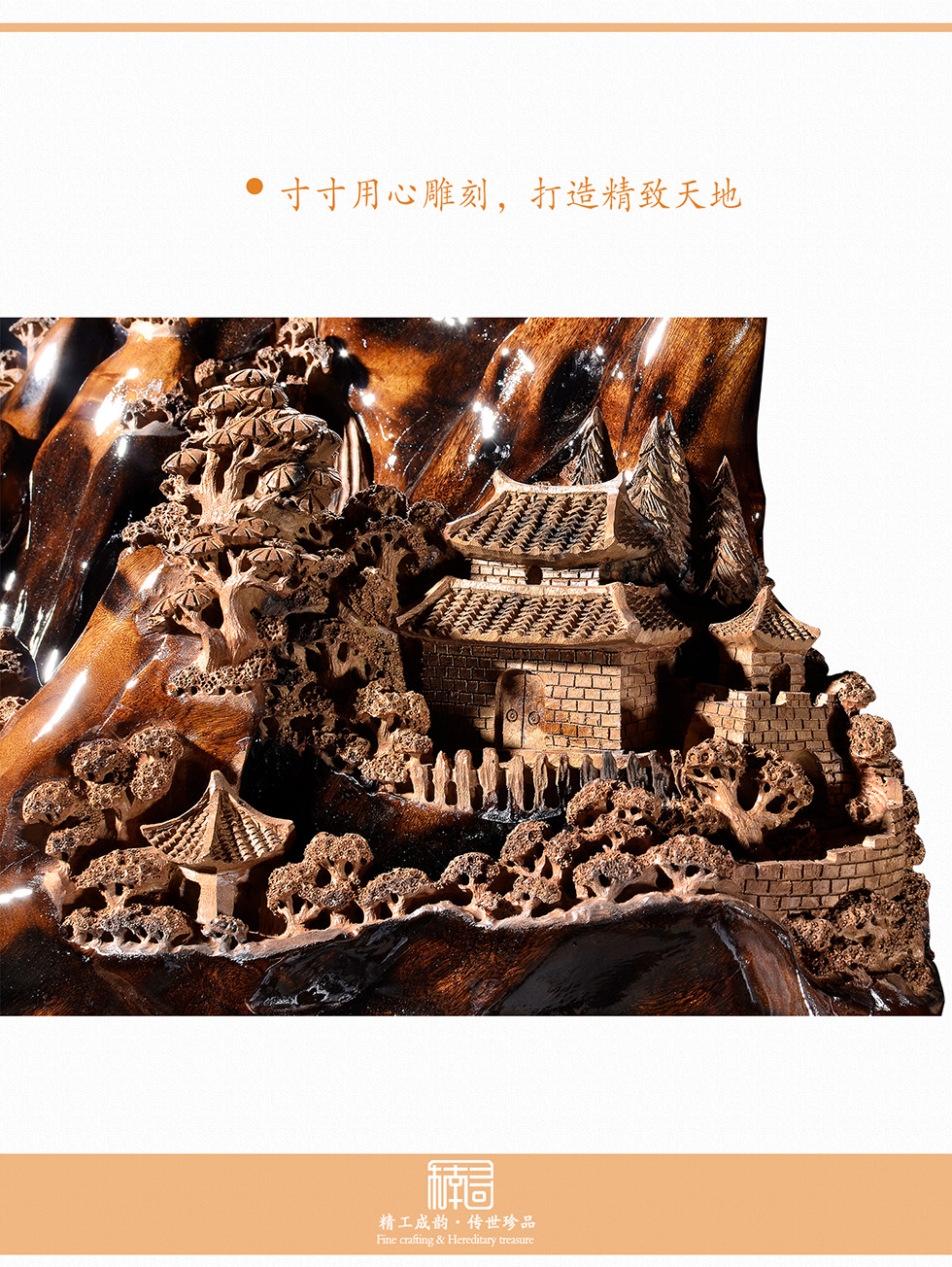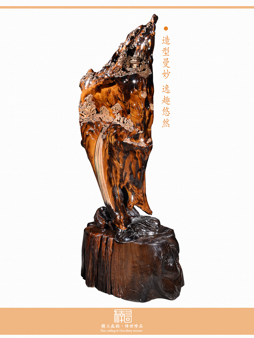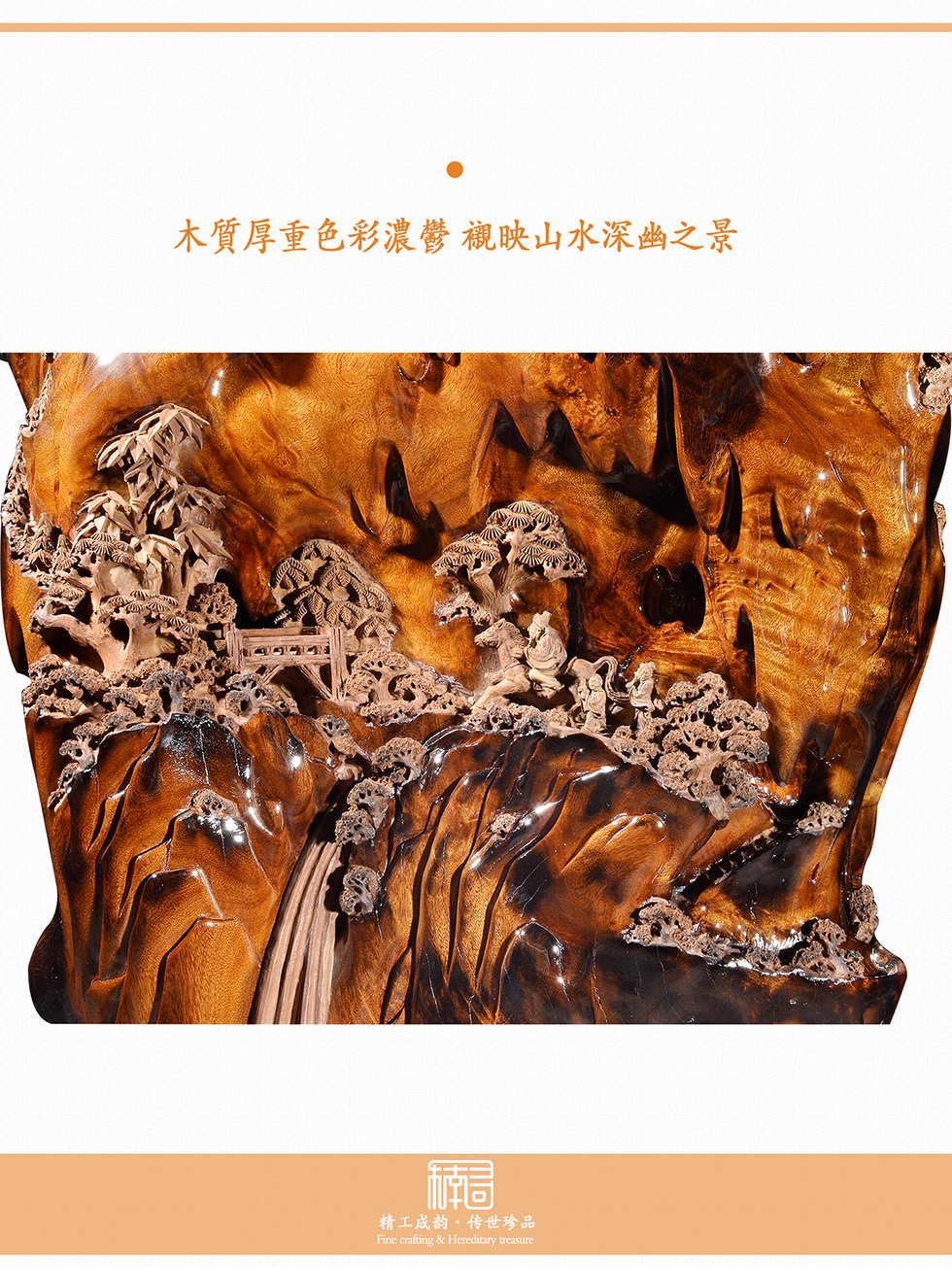 天然成型,精雕细刻,纯手工打磨,透亮润滑如玉,人物造型饱满,刻画栩栩如生,景物错落有致,结构层次分明,画面立体;乌木金丝楠色泽浓郁,自带光影效果,让山石更逼真,为画面增添神秘感,阵阵楠香飘送,让人不觉心旷神怡。